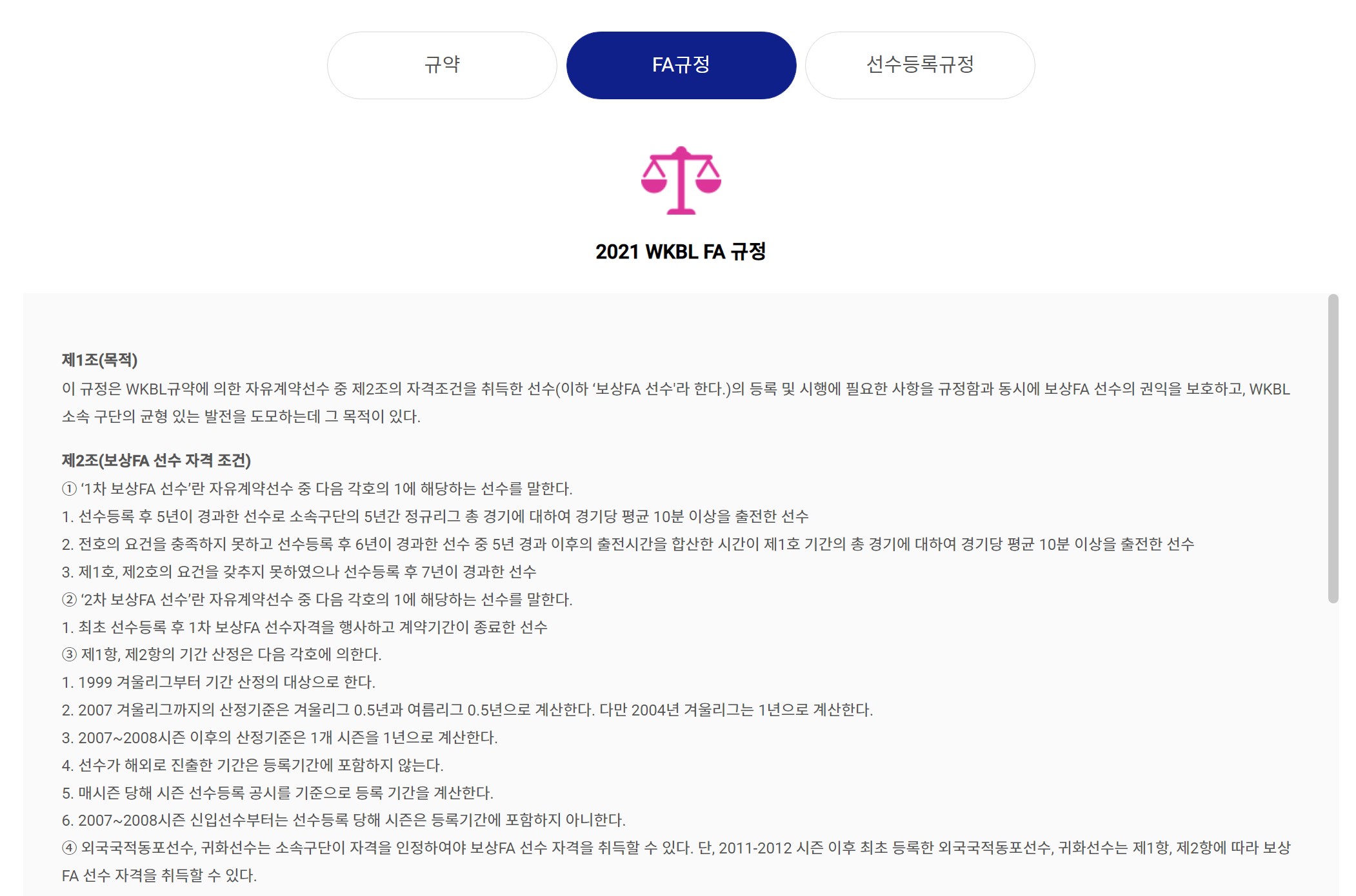 WKBL FA와 관련된 규정은 홈페이지에 가면(https://www.wkbl.or.kr/about/rule_fa.asp)자세히 나와 있다. 뭐.. 대충 읽다보면 '이건 뭔 소리지'싶은 부분도 있긴 하지만...