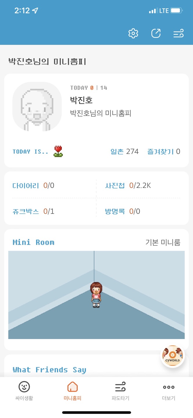싸이월드의 자료가 복구됐다. 사진첩 옆에 2.2K라고 쓰여 있는데, 그만큼 자료가 돌아왔다는 건가 보다.