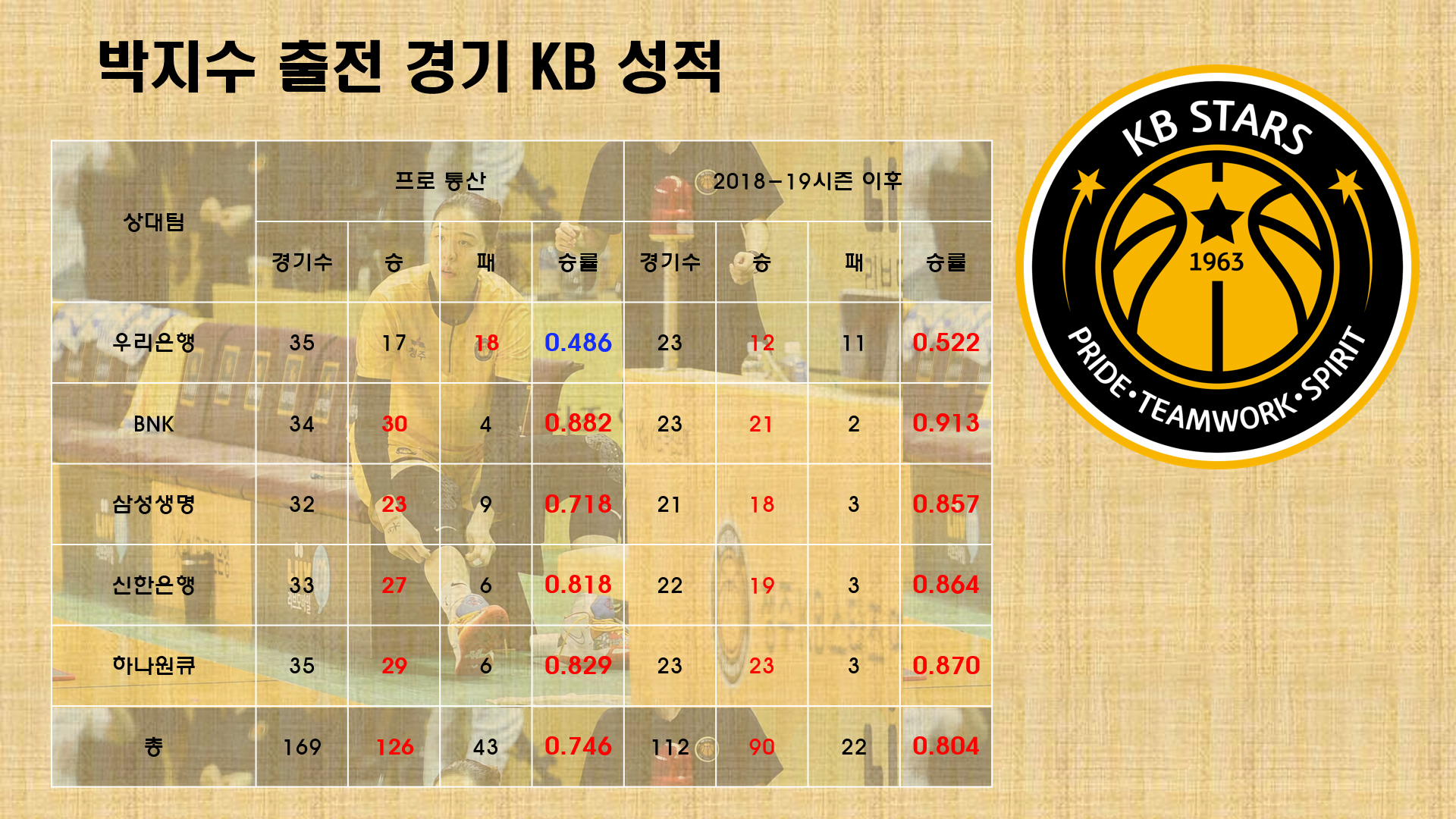 어차피 박지수는 KB의 전력이고 핵심이다. 박지수가 없을 때의 가능성은 냉정히 '쉽지 않다'가 결론이다. 결국은 최고의 전력을 갖추는 시점, 그리고 그 이후의 방향, 그 방향으로 가기 위한 기저 조건을 갖추는 것에 집중해야 한다.
