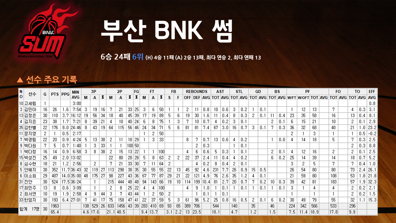 온 볼 플레이어가 많은 BNK의 고민을 덜어줄 것으로 기대를 모았던 한엄지 역시 좀처럼 회복하지 못했다. 한엄지는 30경기에 모두 나섰지만, 6.4점 5.2리바운드에 그쳤다. FA로 이적했던 2022-23시즌보다 시간과 득점, 리바운드 모두 줄었다. 신한은행 시절인 2020-21시즌을 기대했던 BNK에게는 아쉬운 결과였다.