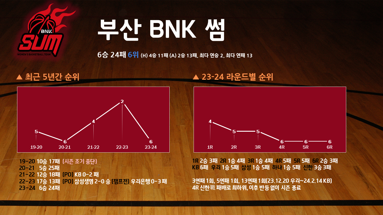 "선수들이 프론트 내부의 갈등에 영향을 받는다는 게 말이 되는가"라는 원론적인 지적도 있었지만, 이러한 사태가 공론화된 이후 BNK의 분위기가 동기부여 없이 부유한 것도 사실이다. 무려 13연패의 늪에 빠지기도 했던 BNK는 마지막 6라운드에 2승을 수확하며 가까스로 시즌을 마무리했다. 최악의 시즌 출발을 보였던 신한은행에도 추월을 당했고, 3년 만에 다시 꼴찌가 됐다.