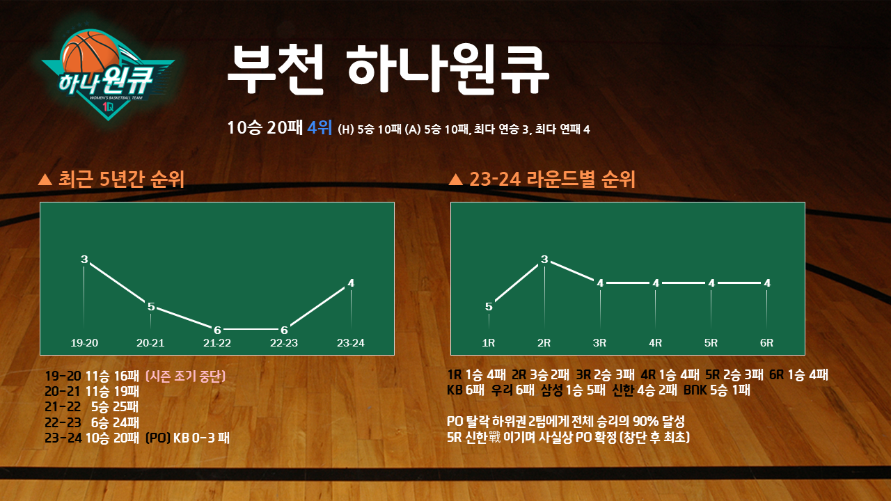 결과적으로 하나원큐의 2023-24시즌은 성공이다. 하나원큐의 목표는 분명했다. 시즌 10승이었다. 일단 두 자릿수 승리로 복귀하고 팀을 더 가다듬어 2024-25시즌에는 플레이오프 진출이나 더 높은 곳을 노리겠다는 순차적인 계획이었다. 물론, 2023-24시즌에도 10승을 우선의 목표로 하되, 가능성이 보이면 플레이오프를 비롯해 그 이상도 노리겠다는 것이었다. 대다수의 팀들이 "우선은 플레이오프를 목표로 하고, 거기에 올라서면 우승을 위해 경쟁하겠다"고 하는 것 보다 한 단계 낮은 목표지만, 무턱대고 망상을 꿈꾸기보다 현실적인 발전 방향을 설정했다고 볼 수 있다. 2년 동안 단 11승(49패, 승률 18.3%)을 거둔 팀이다. 창단 이래 단 한 번도 5할 승률을 넘어본 적이 없다. 아니, 4할을 넘어본 것도 창단 해인 2012-13시즌(14승 21패, 승률 40%)과 코로나19로 시즌이 조기 중단된 2019-20시즌(11승 16패, 승률 40.7%) 단 두 번 뿐이다. 가장 화려했던 역사는 첼시 리와 함께 기록 삭제로 지워졌다. 시즌을 마친 후, '목표 달성'이라는 말을 꺼내 본 적이 없기에 스스로 가장 냉정한 평가를 내렸다고 할 수 있다.