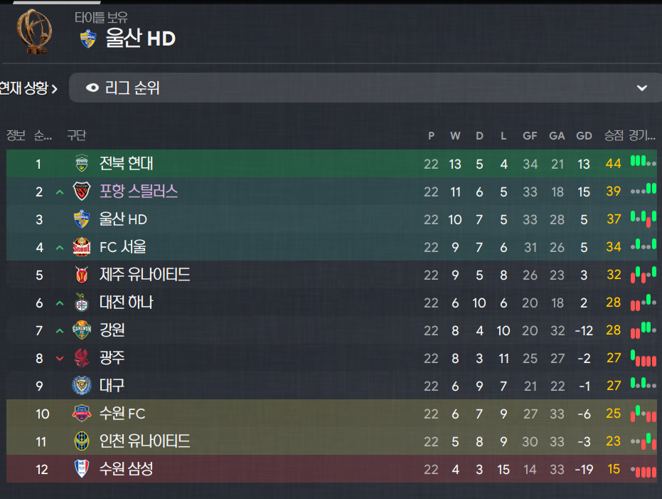 이 게임은 기본적으로 지난 시즌(유럽은 23-24시즌, K리그는 2023시즌)부터 시작인데, 최신 업데이트 스쿼드로 시작하면 작년인데 올해 감독들이 팀을 맡고 있는다. 예를 들어 2023시즌인데 포항은 박태하, 서울은 김기동.. 이런 식이다. 뭔가 현실감이 떨어지는데, 그렇다고 그냥 두면 지금 스쿼드랑 달라지니 이것도 현실감이 떨어지고...
