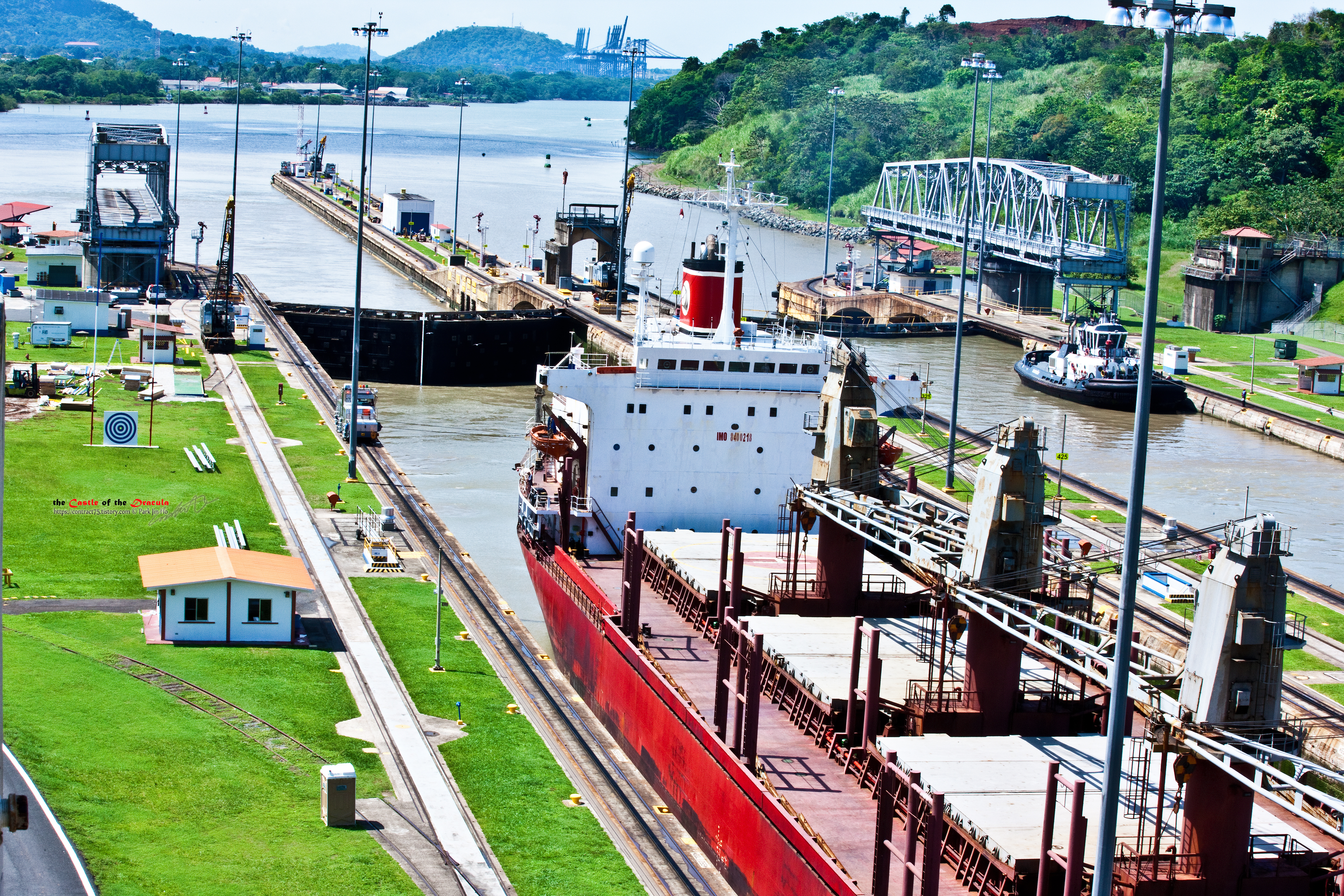 물이 그다지 깨끗하지는 않다. 솔직히 공사장 폐수 느낌이다. 일단 여기서 중요한 것은 수질이 아니다. 파나마 지협을 지나기 위해서는 바다보다 26m 높이 위치한 가툰 호수를 지나야 한다. 때문에 물이 엘리베이터 형식으로 갑실 사이의 높이를 조절하여 선박을 높은 위치로 띄워서 갑문을 지나게 한다. 갑실 사이의 물의 높이가 같아지면 갑문이 열리고 선박이 지나갈 수 있다. 사진 순서대로 물 높이가 달라지는 것이 보일 것이다.