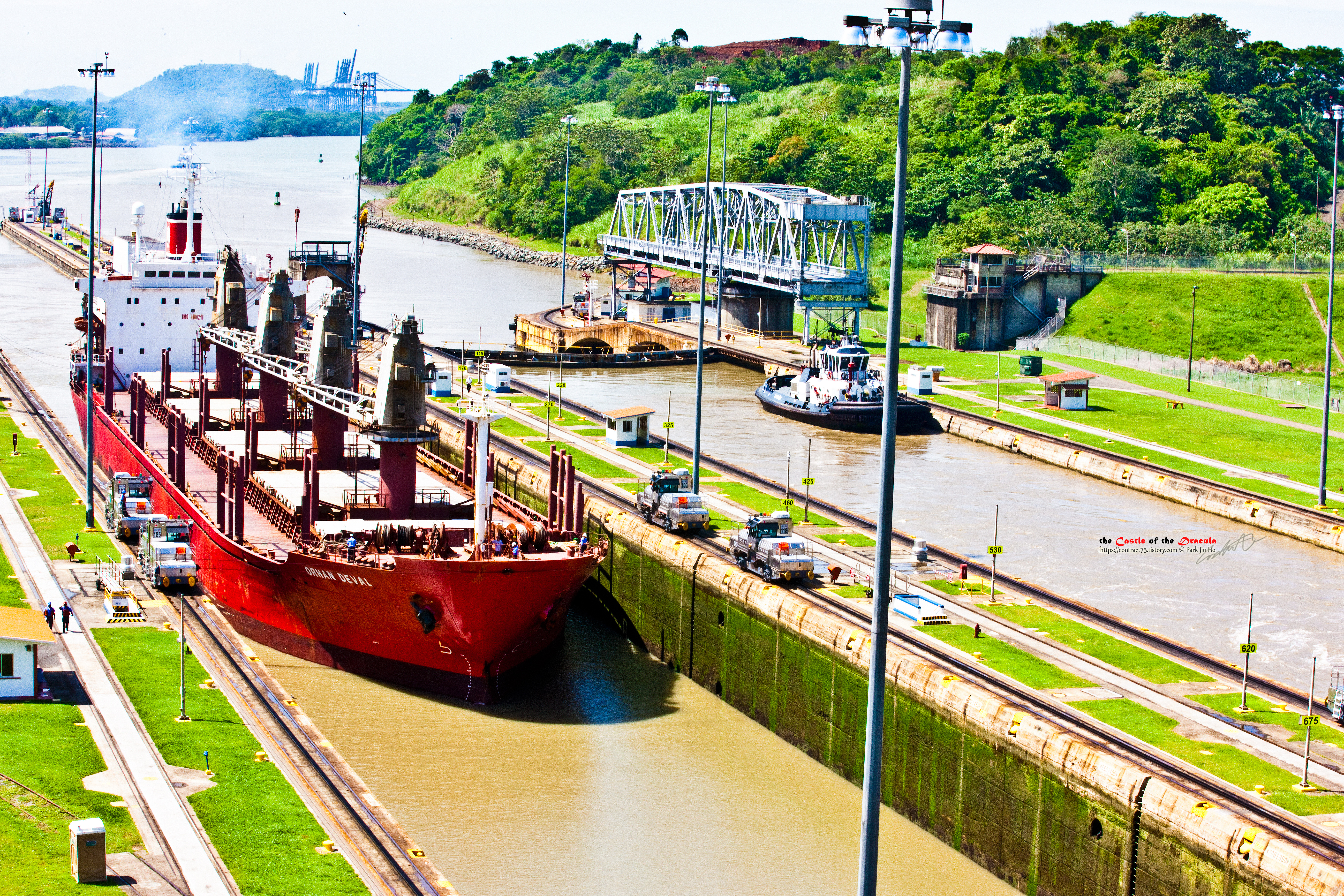 통행 허가가 떨어진 선박이 조심스럽게 갑문 안으로 진입하고 있다. 수로에 작은 배가 진입한 것처럼 보이지만 상당한 크기다. 좌우에 따르고 있는 전동차들이 갑문 내에서 선박을 끌고 이동하는 견인 차량 역할을 한다.