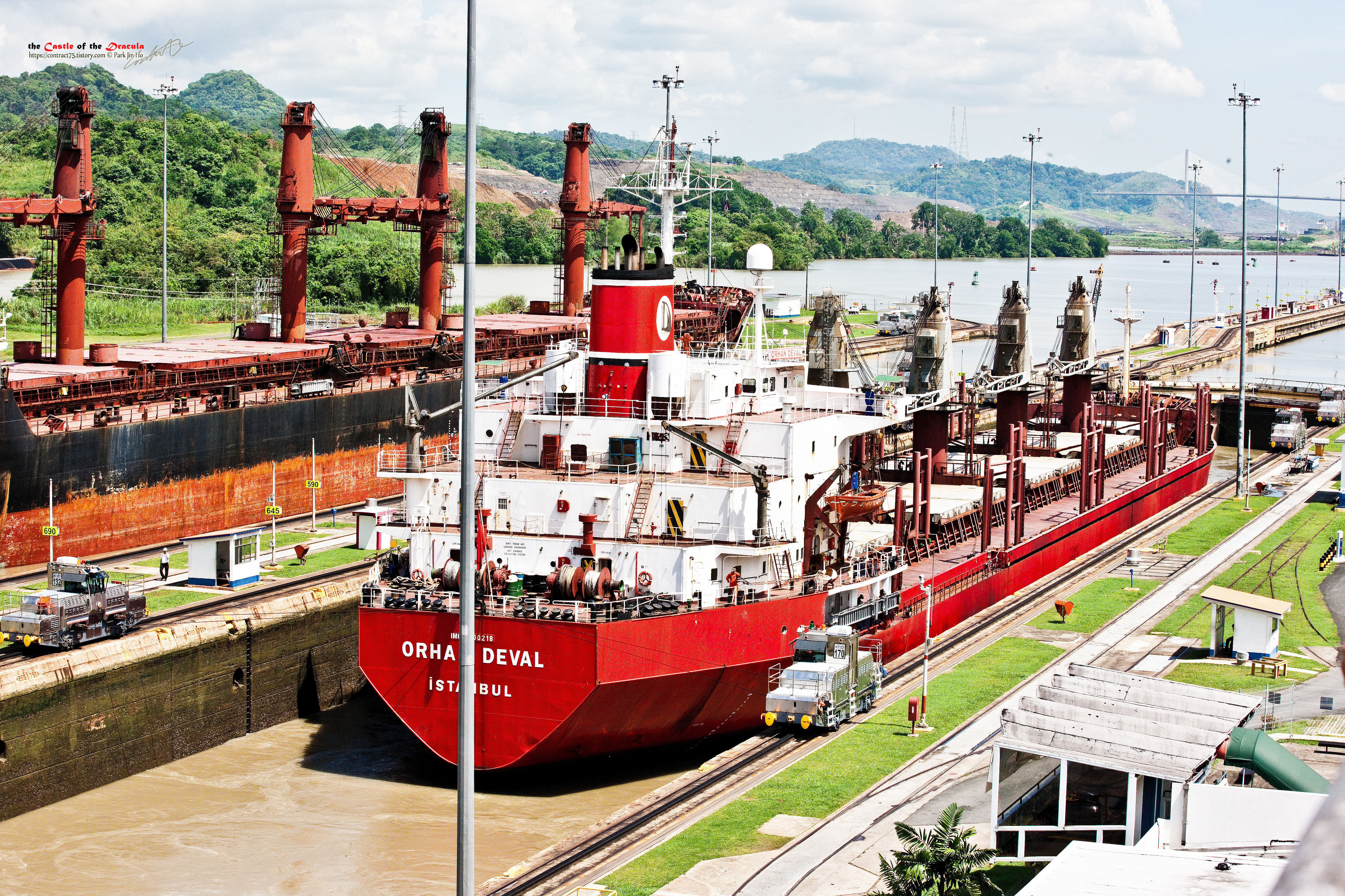 미라플로레스 갑문은 한 번에 통과할 수 없다. 갑문을 지나면 미라 플로레스 호수로 이어지는데 호수와 수위를 맞추기 위해서는 한차례 더 갑문을 지나야 한다. 앞쪽의 갑문이 열릴 때까지 다시 대기에 들어갔다. 배에 써있는 걸 보니 튀르키예 이스탄불에서 온 선박인 것 같다. 다만 'ORHAN DEVAL'이라는 게 선박명인지, 사명인지, 선박 소유주 이름인지는 모르겠다. 솔직히 어디 말인지도 모른다.