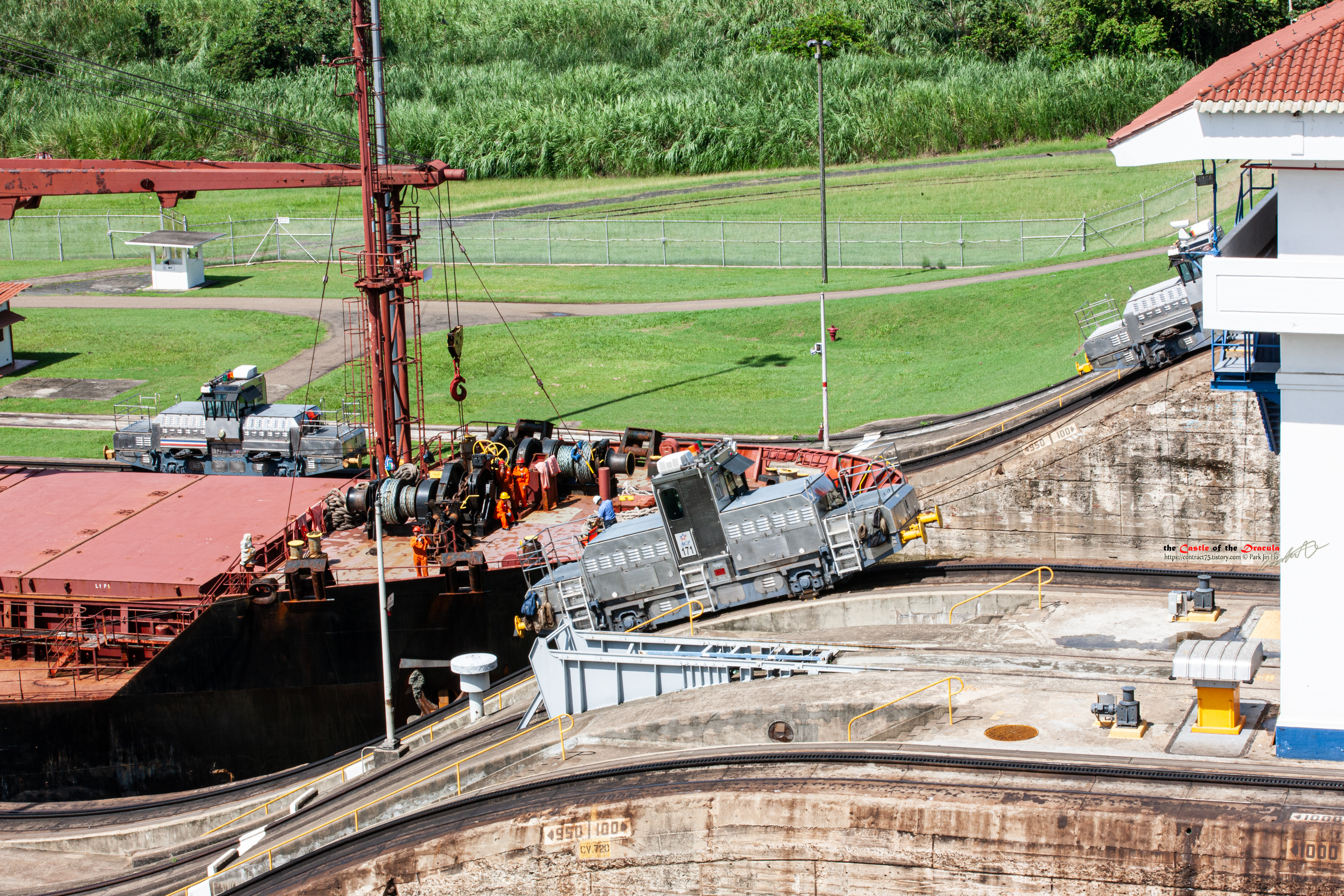 수로에 진입한 선박을 좌우의 전동차들이 견인하고 있다. 선박의 규모에 비해 아주 넓지는 않은 수로인데, 선박이 수로에 충돌하지 않고 지날 수 있는 이유가 견인용 전동차들 때문이라고 한다. 만약 이 선박이 수로와 충돌하는 사고가 발생하면, 사고가 완전히 수습될 때까지 해당 수로는 사용할 수 없다.