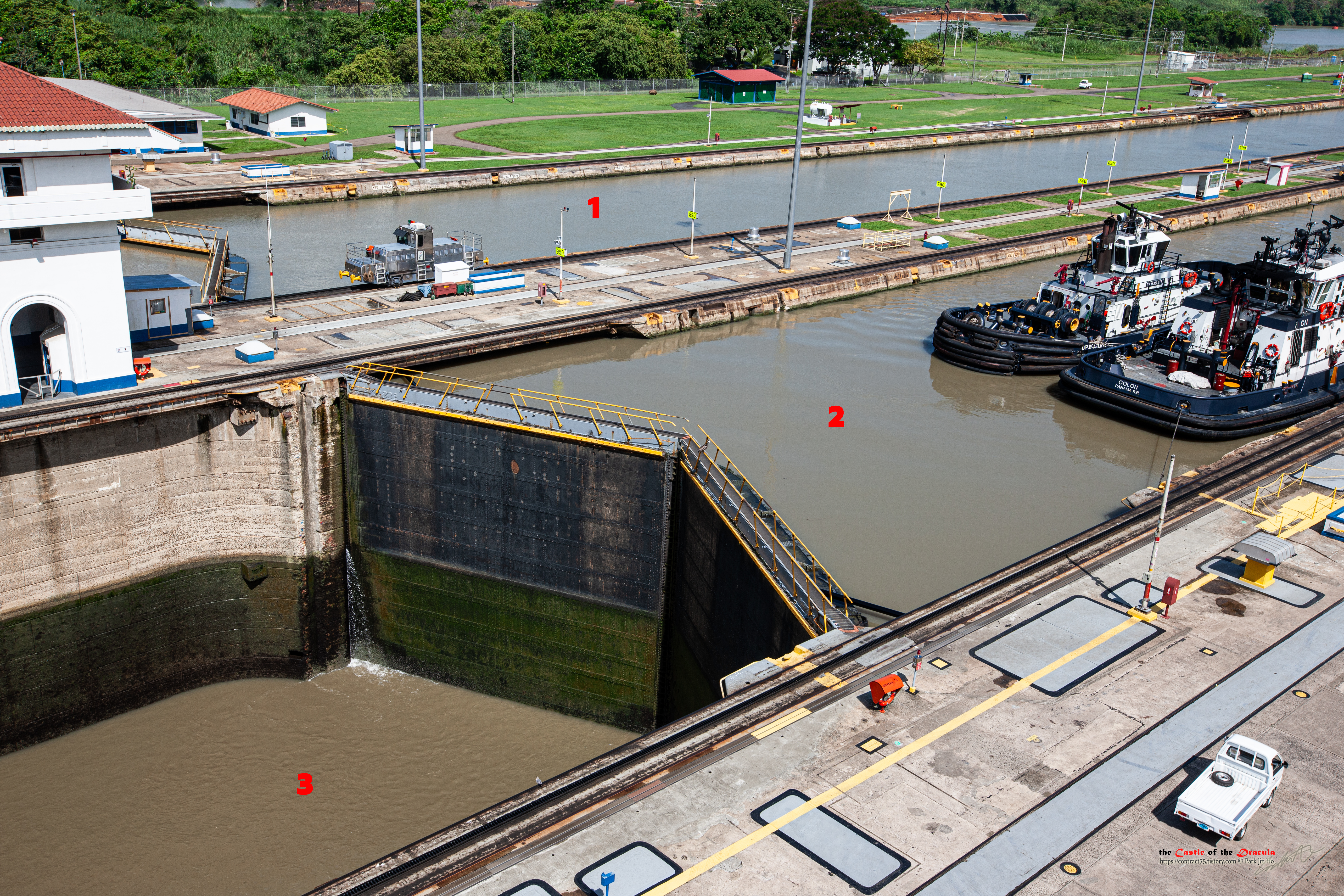 운하가 관통하는 파나마의 지형이 평탄하지 않기 때문에 갑문이 구간을 구분하며 수로의 높이를 조절한다. 사진을 보면 1번은 옆의 다른 수로다. 같은 수로는 갑문으로 막혀 2-3의 수위가 서로 다른데, 이 높이를 서로 맞추면서 갑문이 열리고 선박이 지나게 된다.