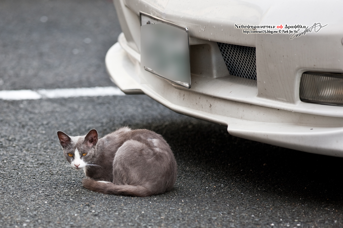 차에 아직 가시지 않은 빗물의 흔적이 분명 오늘과는 달랐던 어제의 날씨를 말해준다. 민박집 바로 옆 주차장에는 '고양이가 살고 있다'는 표지판이 붙어있다. 길냥이는 길냥이지만 뭔가 있어보이는 길냥이입니다. 새벽부터 카메라를 들이대는 불청객을 강하게 쏘아본다.