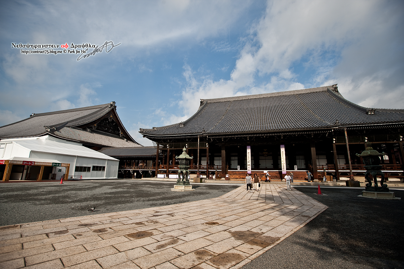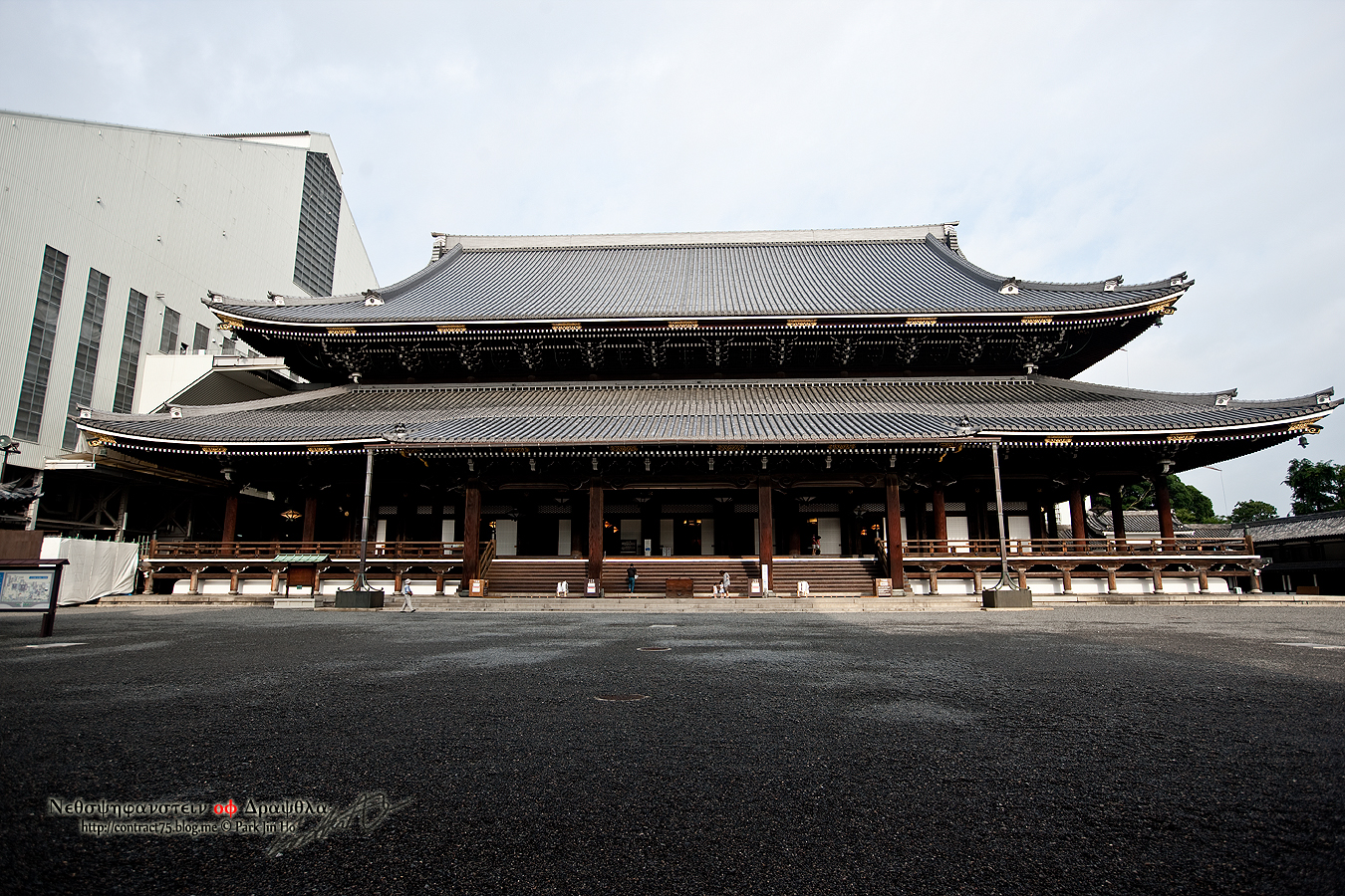 안으로 들어가면 보이는 거대한 건물이 히가시혼간지의 본당인 고에이도(御影堂)는 일본 목조 건물 중 최대 크기라고 한다. 사실 들어서는 순간 절 입구의 문보다 더 거대한 본당의 위치에 압도됐었다. 본당 입구에 있는 사람들의 크기와 견주어 보면 이 본당이 얼마나 큰 지 알 수 있다. 전체적으로 우리나라에서 봤던 사찰보다 크기가 거대하다는 느낌이다.