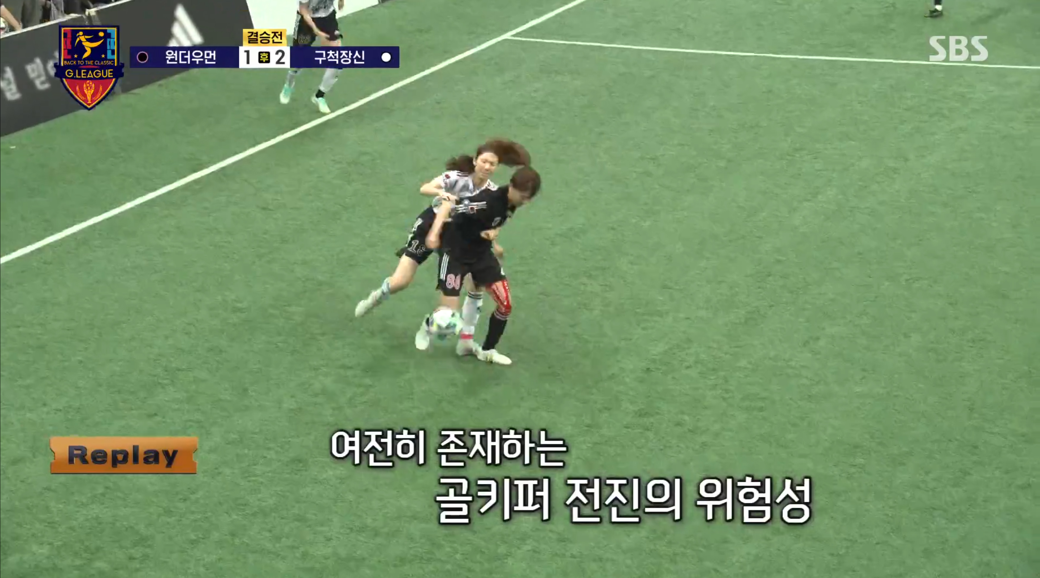 유망한 공격기회가 아니었다? 기본적으로 공격수 둘에 수비수 하나인 상황이다. 완벽한 득점 기회다. 이를 종합했을 때, 해당 파울은 다이렉트 퇴장이 나와도 할 말이 없다. 완벽한 득점 기회를 고의적인 파울로 저지한 행위다. 경합 상황에서 플레이를 펼치다가 발생한 것이 아니라, 자신의 실수로 완벽한 위기가 발생하자 수비수가 고의적인 반칙으로 상대를 저지시킨 비신사적인 행위다. 이것이 '유망한 공격 기회가 아니'라는 설명은 이 프로그램에서 뛰고 있는 출연진들에 대한 지나친 비하가 아닐까? 심지어 저 화면은 상대 수비수의 고의적인 반칙으로 제대로 전진이 되고 있지 않은 상황에서 캡쳐된 장면이다. 실수를 범한 수비수가 볼을 잡은 공격수를 안고 잡은 행위로 인해 공격수가 정상적으로 플레이를 진행하지 못한 위치라는 것이다. 캡쳐 자체로도 확실한 찬스지만, 정상적인 상황이었다면 반대쪽에 있던 수비수가 저 정도의 각조차 좁히지 못했다. 캡쳐된 화면보다 더 명백한 득점 찬스였다는 것이다.