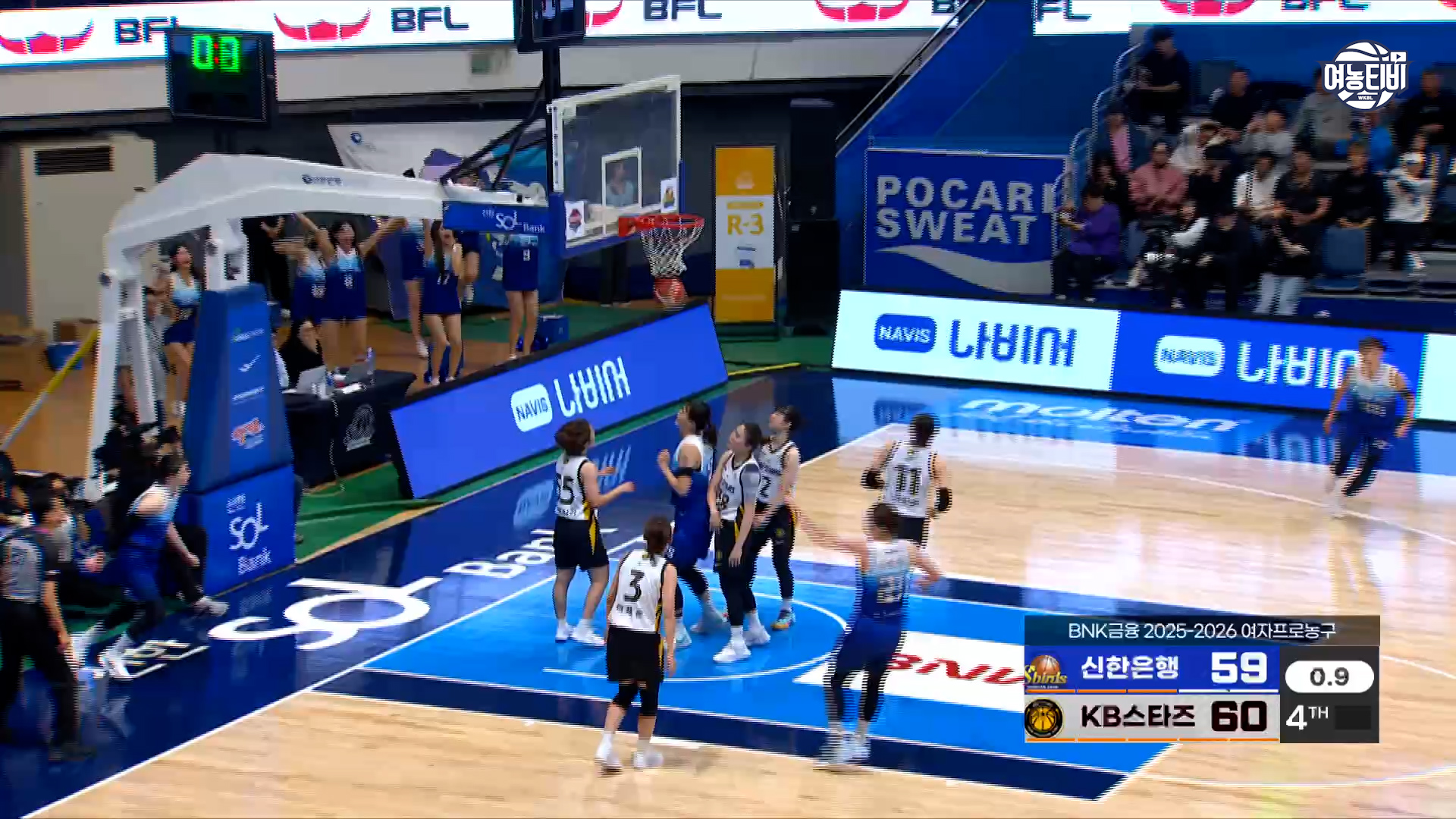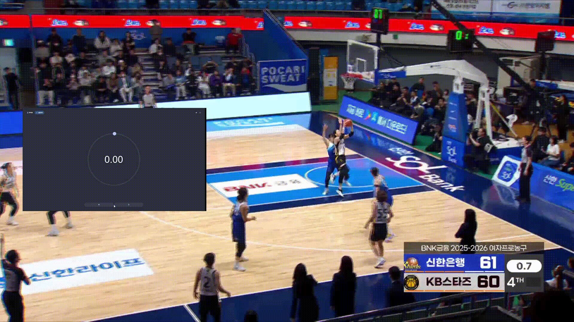 음... 0.7초가 맞는 거 같아요. 신이슬 선수가 득점에 성공한 공이 그물에서 빠져 나오는 순간, 방송 중계 화면에는 0.9초로 되어있지만, 좌측 상단의 계시기는 0.7로 숫자가 바뀌는게 보입니다. 0.7초가 맞았던 거 같네요.