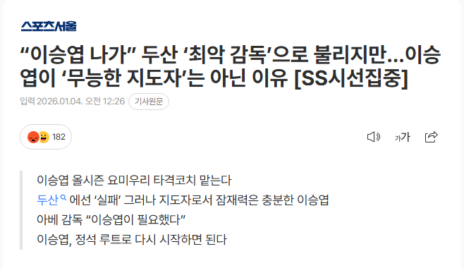 “이승엽 나가” 두산 ‘최악 감독’으로 불리지만…이승엽이 ‘무능한 지도자’는 아닌 이유 [SS시선집중] 입력2026.01.04. 오전 12:26 기사원문 공감 좋아요0슬퍼요0화나요0팬이에요0후속기사 원
